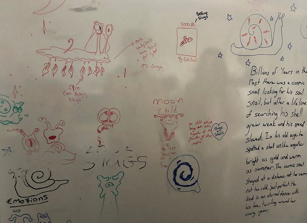 During the second half of our week two within the animation studio, just like the simple stripped back form and shape of our characters. We were set up within our groups again to strip back our own world ‘Snail Dynasty’ and get creative and explore just how our worlds were born, how the planet was born and why was it created. We were prompted to explore how the first life on our planet was born, created and how the first ancestors of our planet had came about, what they looked like and how their story and ways of living developed and influenced life within ‘Snail World’ today. These were all exciting questions to answer and it was really enjoyable to see how everyone’s idea of how life began, developed into the present and how they would view the snails design, language and overall cultural of their world.